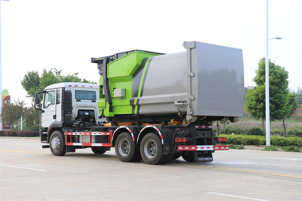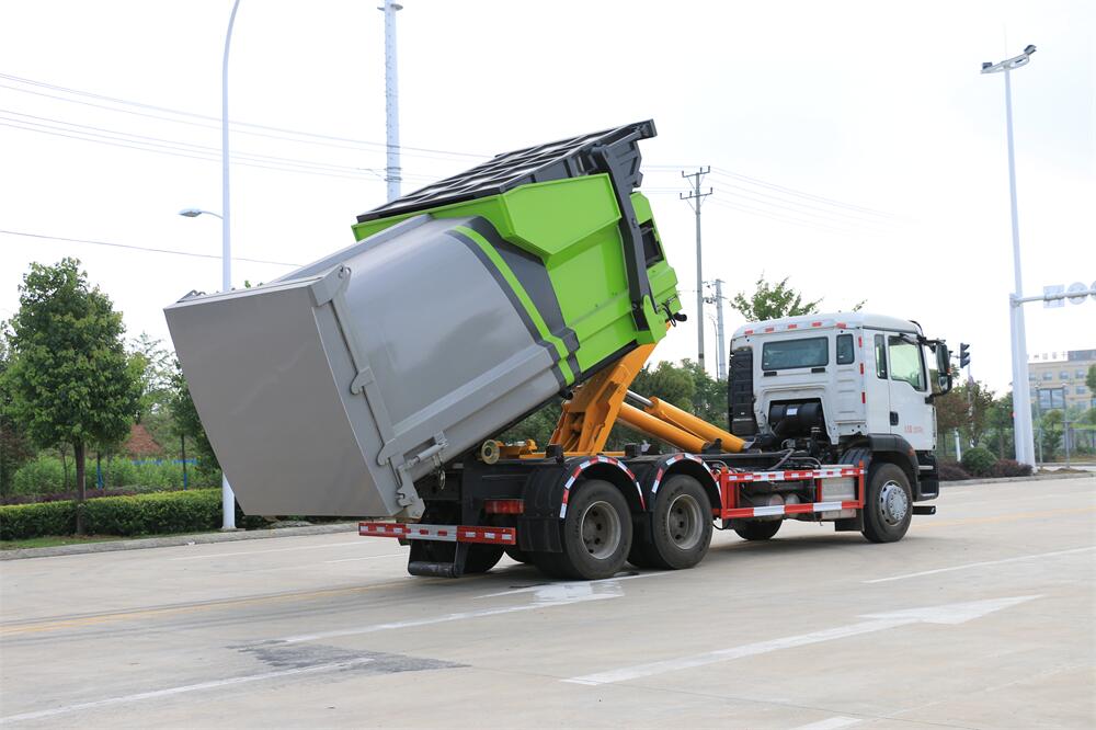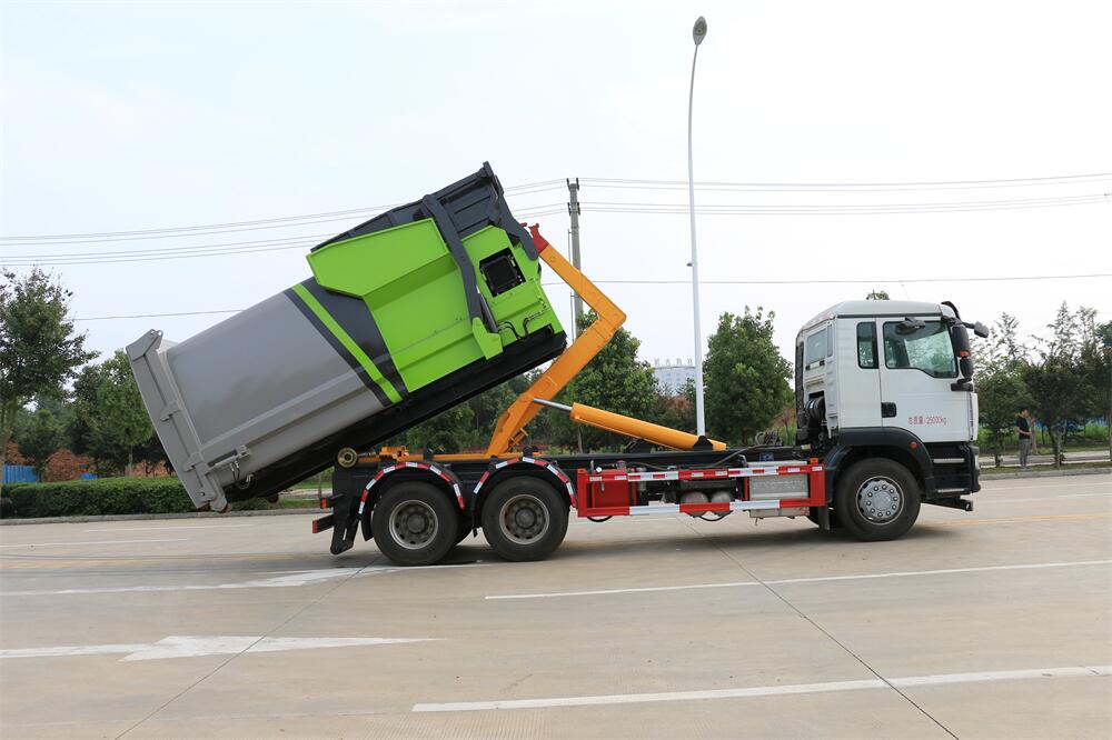 勾臂式垃圾車(車廂可卸式垃圾車)介紹: 車廂可卸式垃圾車又叫拉臂式垃圾車,是一種采用高新設(shè)計(jì)可伸縮的鉤臂,實(shí)現(xiàn)垃圾廂的二次吊裝,自吊上放下,可自行傾倒垃圾的環(huán)衛(wèi)設(shè)備。 拉臂式垃圾車結(jié)構(gòu)簡單,操作穩(wěn)定方便,裝卸效率高,機(jī)械化程度高,節(jié)省人力。鉤臂垃圾車一車可帶多個垃圾廂,在裝卸的運(yùn)輸過程中可有效地避免二次污染。 拉臂垃圾車采用高新設(shè)計(jì)可擺動的鉤臂,垃圾箱由框架、開啟油缸、滑輪、后門和若干加強(qiáng)框架與鋼板焊接而成。調(diào)換貨廂快捷方便,貨廂上帶蓋(倒垃圾時(shí)可翻開),鉤臂垃圾車?yán)鴰w可選用碳鋼、不銹鋼材質(zhì)、內(nèi)部采取環(huán)氧樹脂防腐處理,改裝部分與原車底盤為可分離式,維修方便且保持了原車的機(jī)動性及行駛性能。
