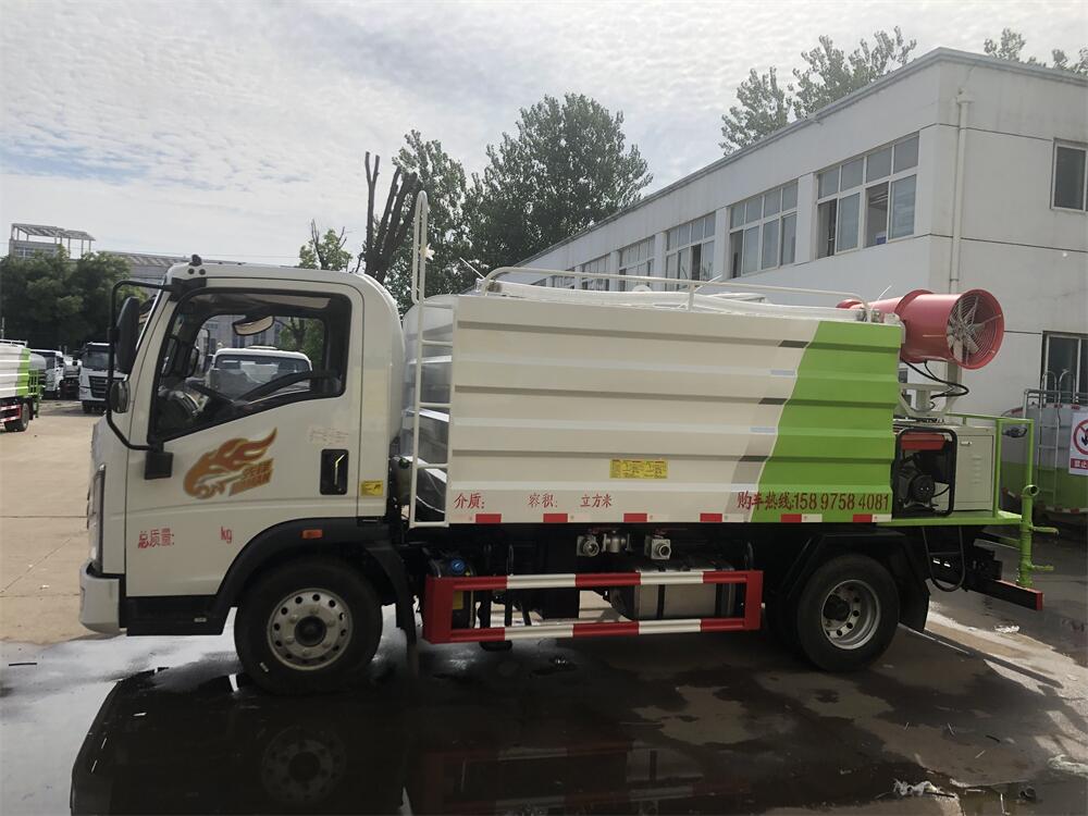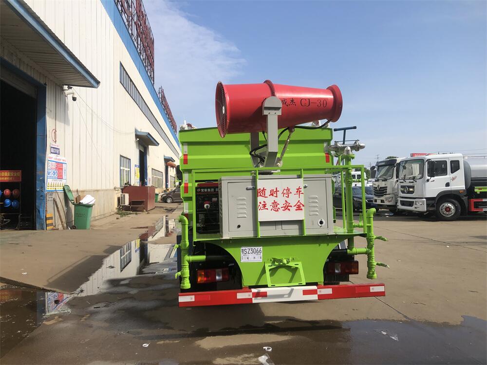上裝配置:罐體容積為 5-7立方,選配風送式霧炮機組射程30米、40米、50米、60米、80米、100米、120米霧炮,罐體鋼板為4mm碳鋼Q235材質,罐內隔板具有防波作用,以減輕汽車行駛時罐體液體沖擊,罐體及整車外形尺寸按照公告。帶大功率專用灑水泵,泵可自吸自排,整車前沖、后灑、側噴、帶65消防接口,后平臺配CLW-50、CLW-60、CLW-80、CLW-100、CLW-120型風送式霧炮機組;罐體前封頭配大功率柴油發(fā)電機組;前封頭帶水位計,后平臺主管路帶1寸澆花接口,后爬梯。帶兩根輸水管及陰陽端。罐體顏色:銀/灰/綠,罐體兩側噴“多功能抑塵車”字樣,貼反光標示。