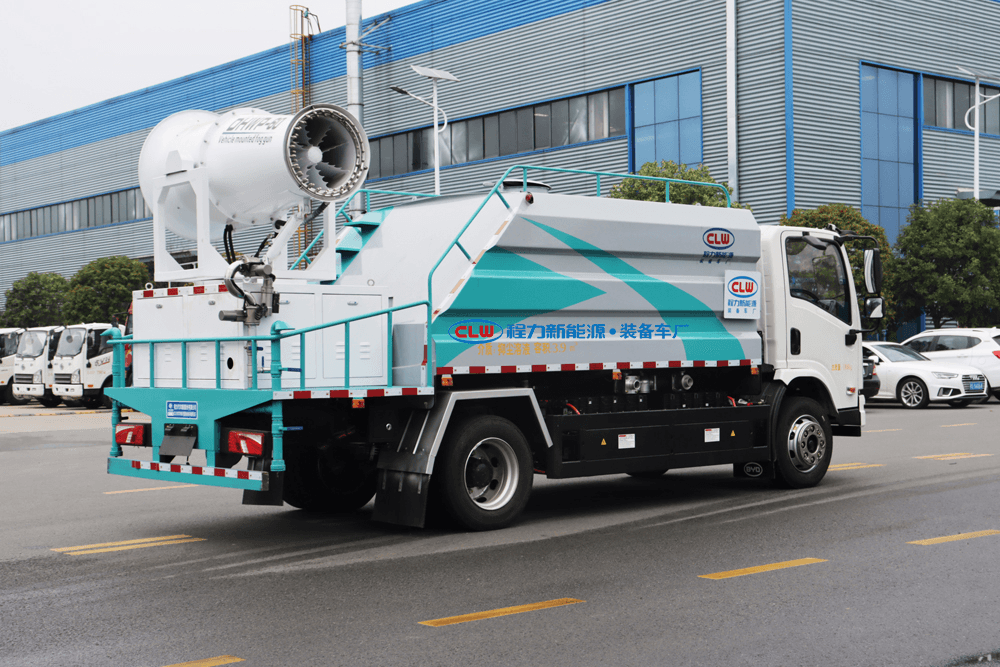 上裝配置:罐體容積為 16立方,選配風送式霧炮機組射程30米、40米、50米、60米、80米、100米、120米霧炮,罐體鋼板為4mm碳鋼Q235材質,罐內隔板具有防波作用,以減輕汽車行駛時罐體液體沖擊,罐體及整車外形尺寸按照公告。帶大功率專用灑水泵,泵可自吸自排,整車前沖、后灑、側噴、帶65消防接口,后平臺配CLW-50、CLW-60、CLW-80、CLW-100、CLW-120型風送式霧炮機組;罐體前封頭配大功率柴油發電機組;前封頭帶水位計,后平臺主管路帶1寸澆花接口,后爬梯。帶兩根輸水管及陰陽端。罐體顏色:銀/灰/綠,罐體兩側噴“多功能抑塵車”字樣,貼反光標示。