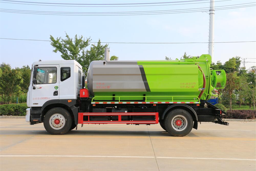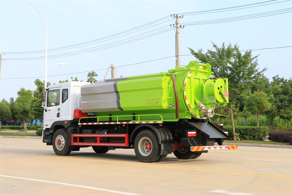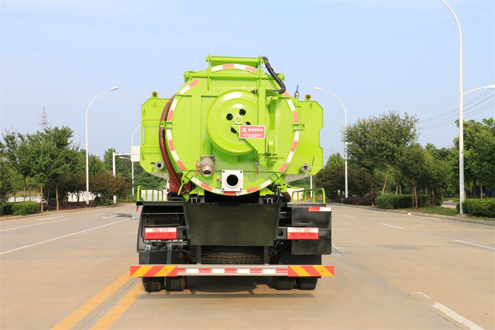 上裝配置:上裝配置:水罐4 立方,污罐 8立方;清洗 部份采用天津通潔,壓力 24Mpa,流量 215L/min,配80米直徑22高壓管帶液壓卷盤; 吸污部份采用山東 SK-15 水循環泵(億豐 10T 雙聯想真空泵),吸污罐帶舉升,后蓋液壓開 啟,帶一個 600mm 快開,罐體后尾部一個 DN150 排污口球閥,一個 DN100 進污口球閥,一個視 污窗,一根 10m 吸污管,一套陰陽端,壓力 表,防溢閥,箭頭燈,淋管裝置,高壓泵帶氣 吹水。配一個 4.5 公斤水雷噴頭,另帶一個 80 公分手持洗車噴頭。