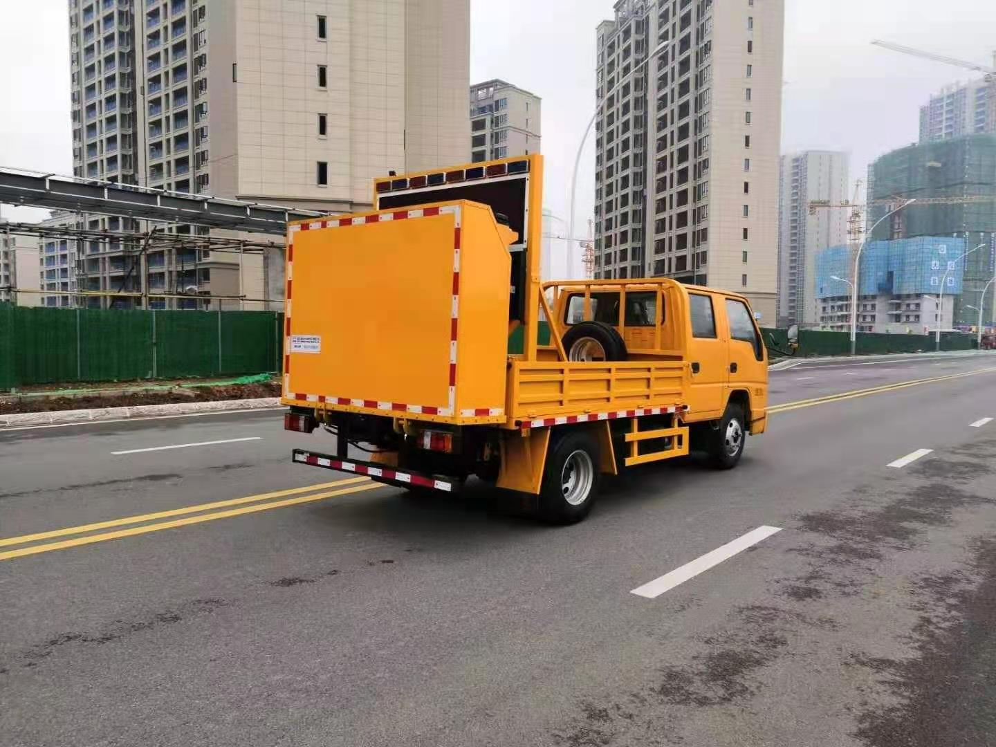 上裝配置:防撞緩沖車尾部設置防撞緩沖塊,防撞緩沖塊采用液壓升降裝置,還配備車載一體化的電子屏、電子箭頭標志牌、頻閃燈及爆閃燈多種**示燈,能夠為后方車輛提供**示和指示方向。箭頭指示標志可對左、右及禁止通行進行導向指示,對道路車輛提供主動安全引導和安全**示,**大限度降低施工對**流量的影響并確保安全。尾部升降和燈具采用遙控**,可在車輛附近安全**防撞緩沖塊的升降和**示燈的開關。