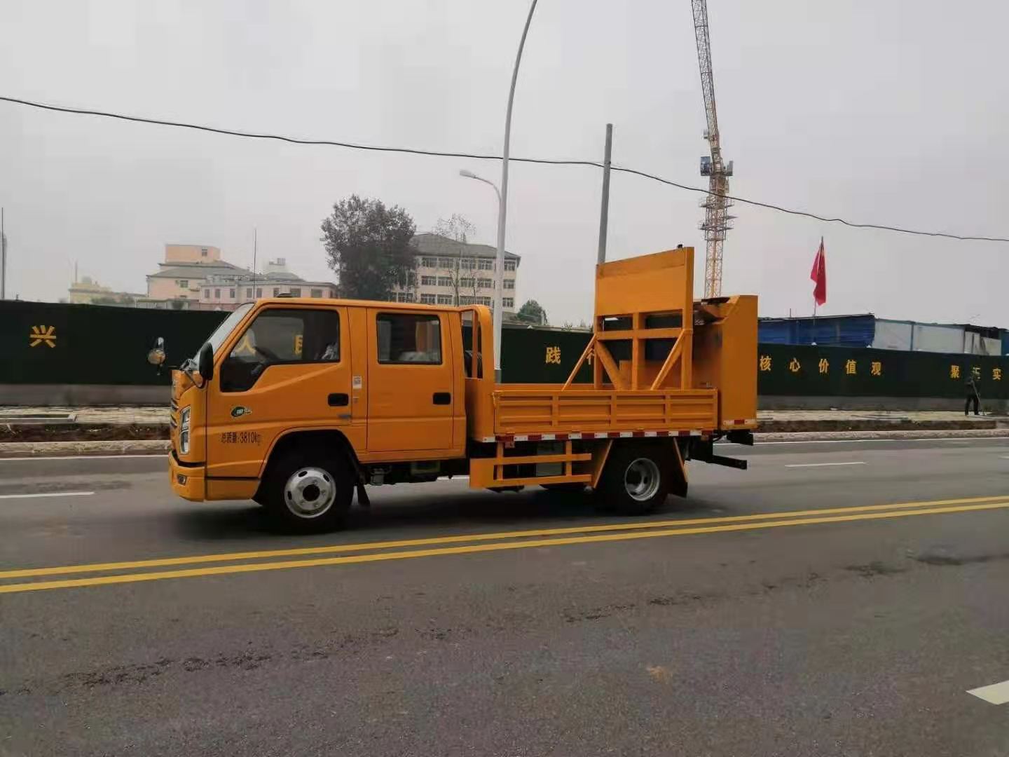 四,駕駛室后部裝有吊機,增加整車**功能,可用于客戶對施工中的重物進行吊運。
